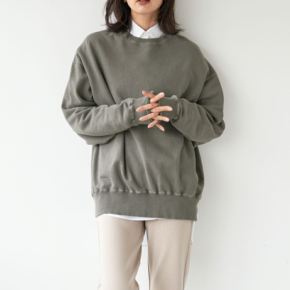 程よい肉感の裏毛にピグメント染め、バイオ加工を施したラフな雰囲気たっぷりのプルオーバーです。カジュアルなスウェットですが、MIICA&DEALオリジナルのニュアンスカラーで温かみのある雰囲気に仕上がりました。オーバーサイズの身幅、たっぷりとったアームホールに裾すぼまりのシルエットのゆるっと感が、こなれた印象に。ロンTやタートルインでイージーな着こなしや、あえてシャツを入れてきちんと感をプラスするのも今っぽくオススメです。